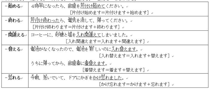 ※ほかにも、‐始(はじ)める、‐終(お)わる、‐間(ま)違(ちが)える、‐替(か)える などがある。